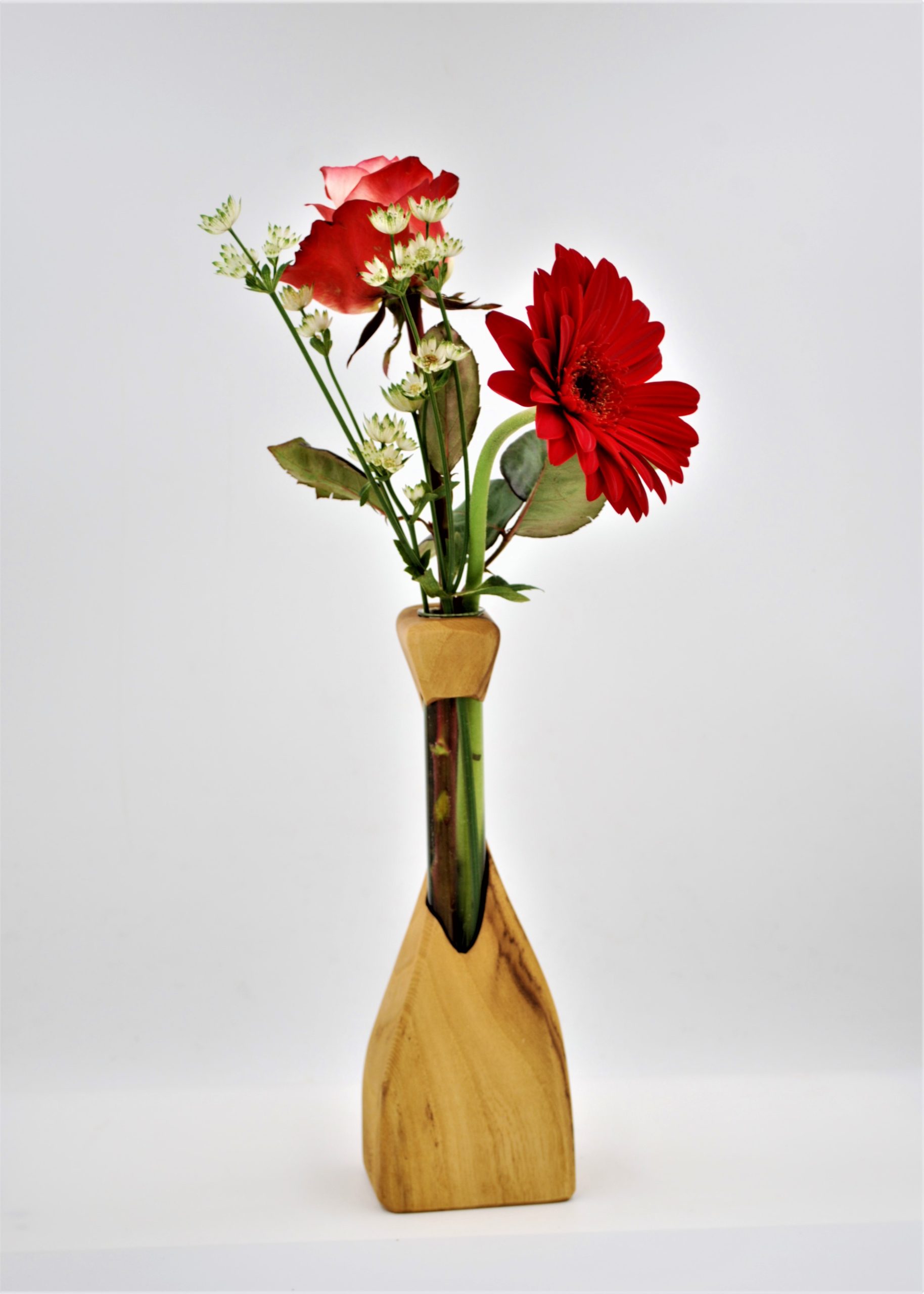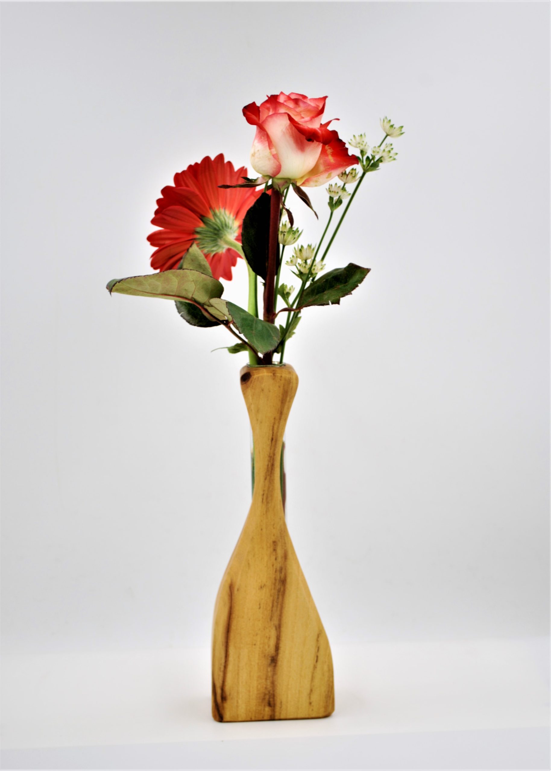 Diese Vase wurde aus einer Akazie hergestellt und handgefertigt. Die Maserung hat eine sehr schöne, hellbraune Farbe mit ein paar dunkelbraunen Stellen. Die Vase wurde mit einem speziellen Öl mehrmals geölt.