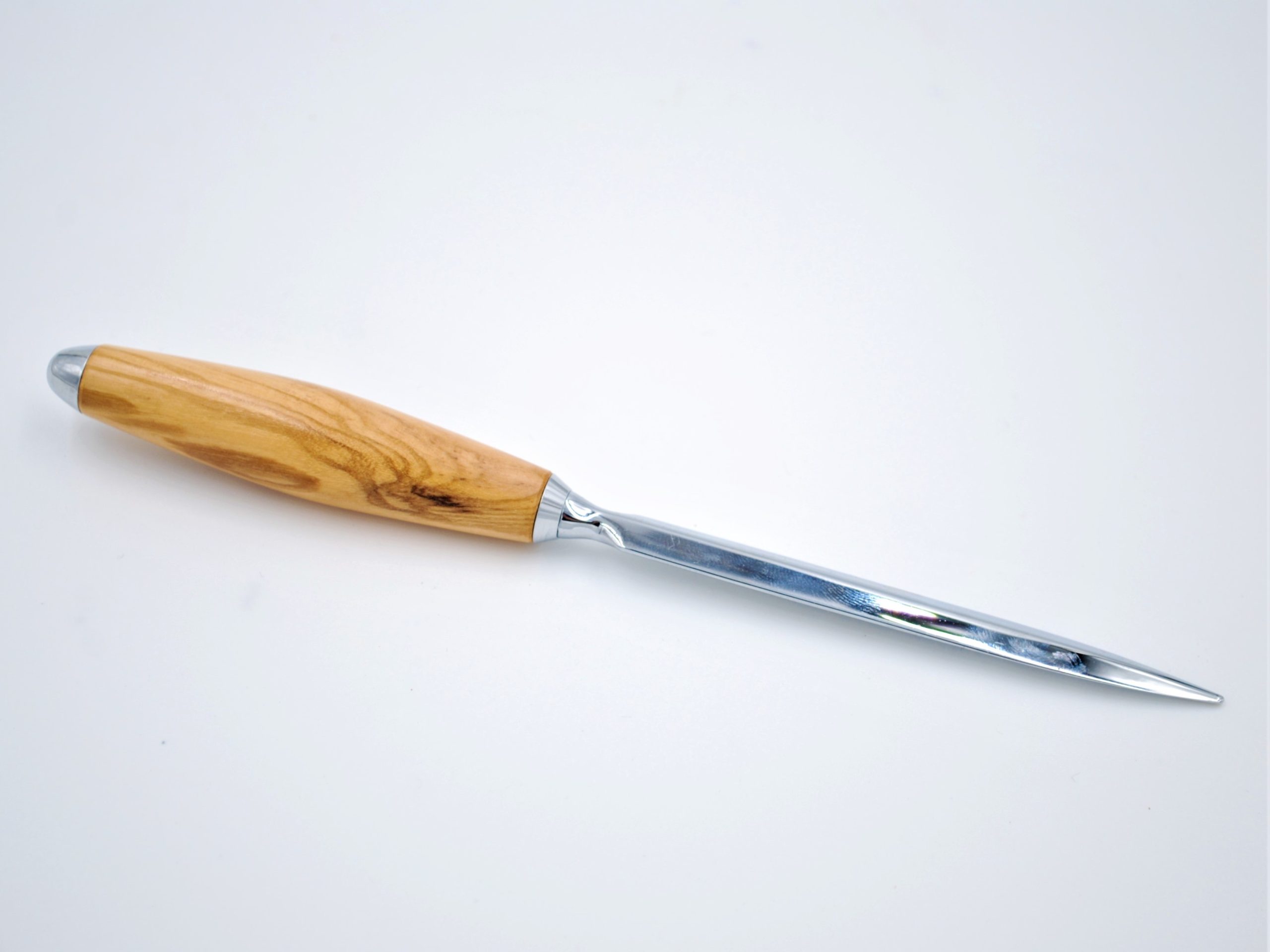 Dieser Brieföffner wurde aus einem Olivenholz handgedrechselt. Das Holz der Olive hat eine hellbraune Farbe mit einer sehr schönen linearen dunklen Struktur. Die Oberfläche wurde lackiert damit sich das Holz nicht so schnell abnutzt. Jedes Stück ist ein tolles Unikat.