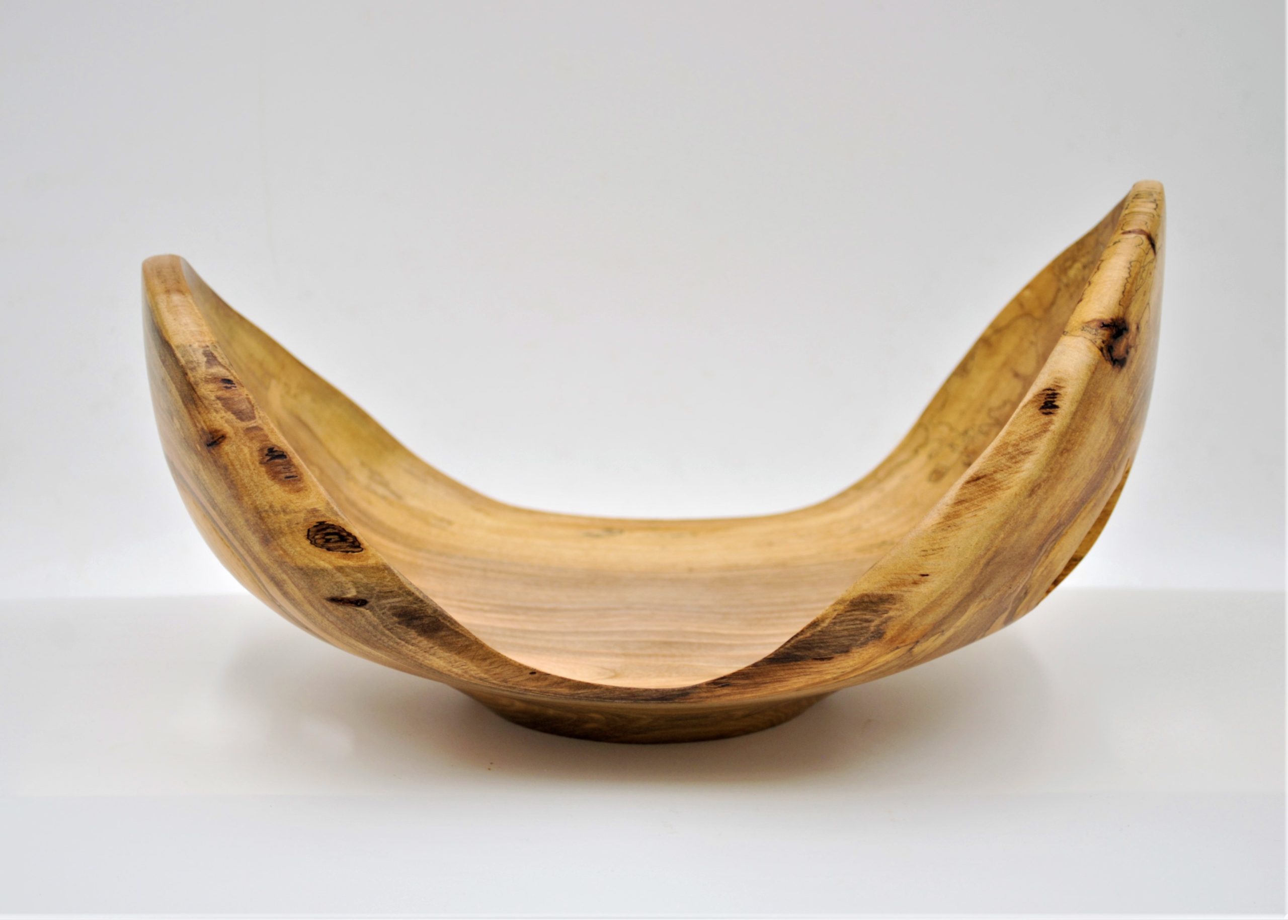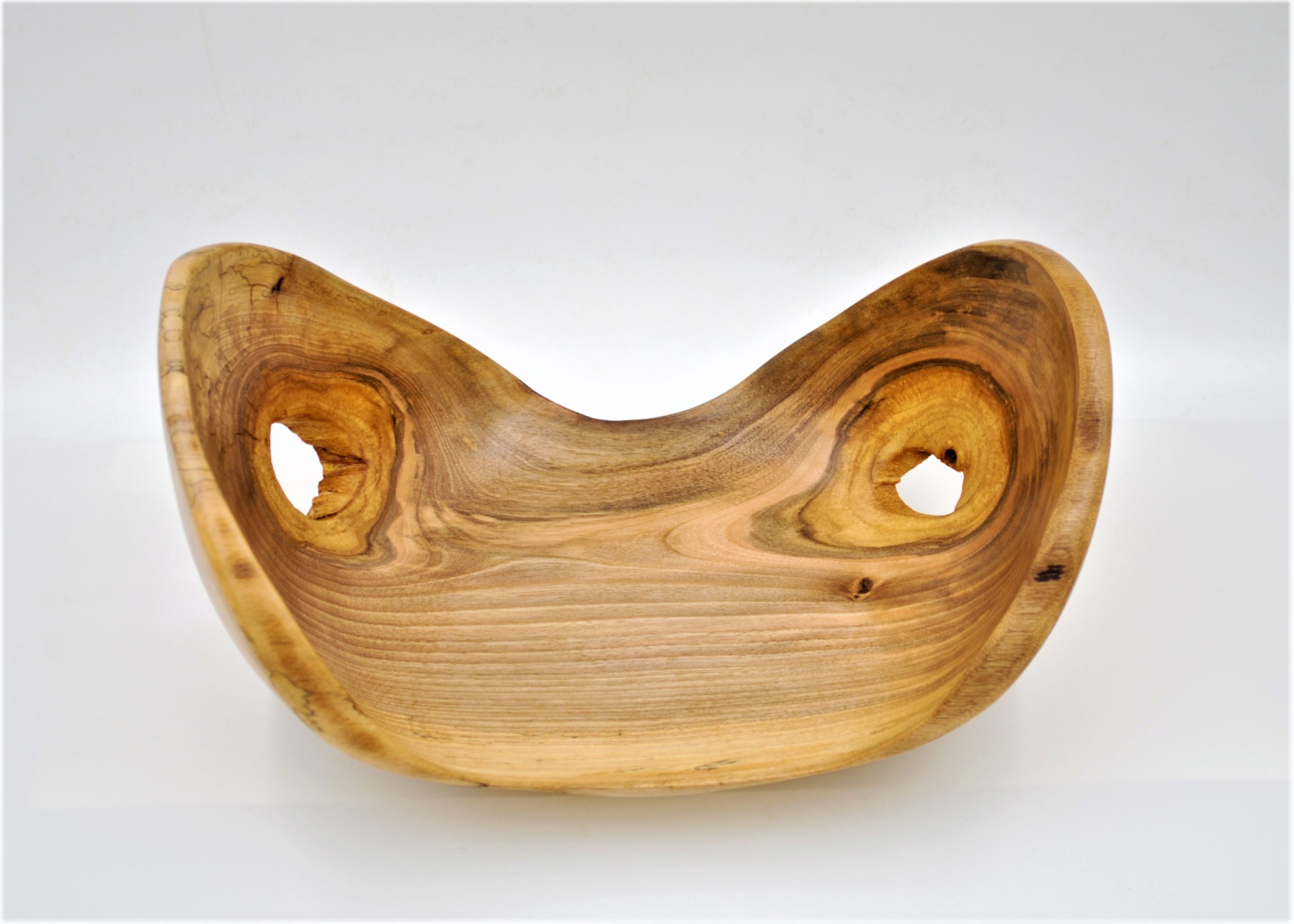 Diese Naturrandschale wurde aus einem Nussbaum gedrechselt. Die Maserung des Holzes hat eine sehr schöne, durchgehend dunkelbraune Färbung. Die Einschlüsse entstanden aufgrund von Kernfäule des Baumes und verleihen der Schale eine sehr schöne rustikale Optik.